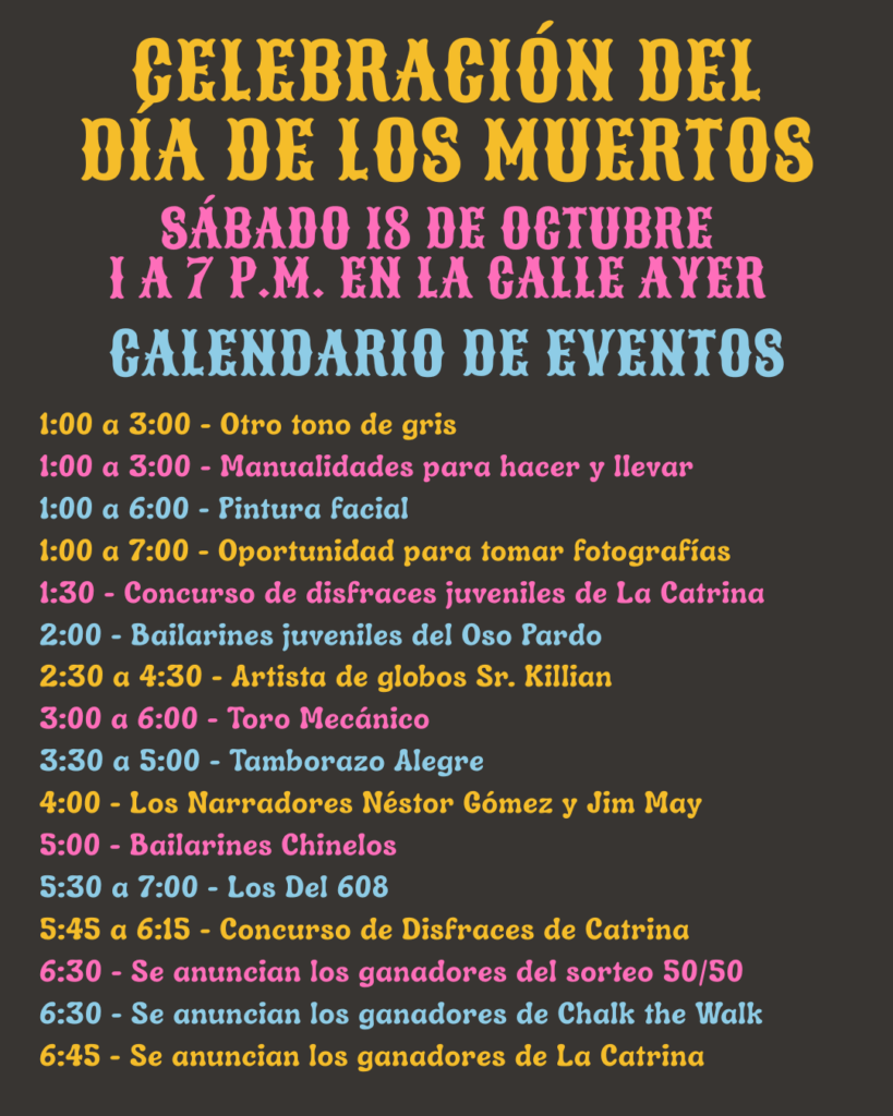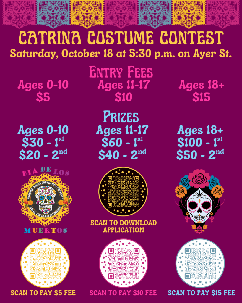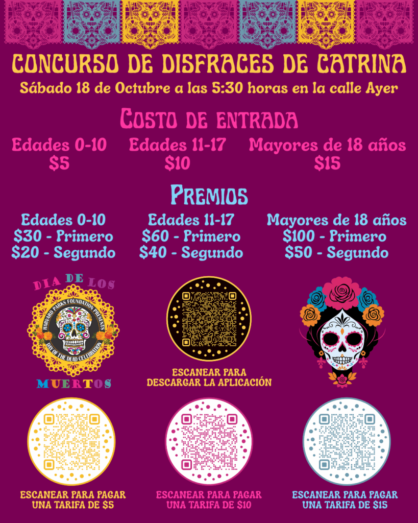 ¡Únase a nosotros en el Concurso de Disfraces de Catrina! ¡Los niños pueden ganar hasta $30, los adolescentes hasta $60 y los adultos hasta $100 si tienen los mejores disfraces de su grupo de edad! Para inscribirse en el concurso, descargue y complete la solicitud.