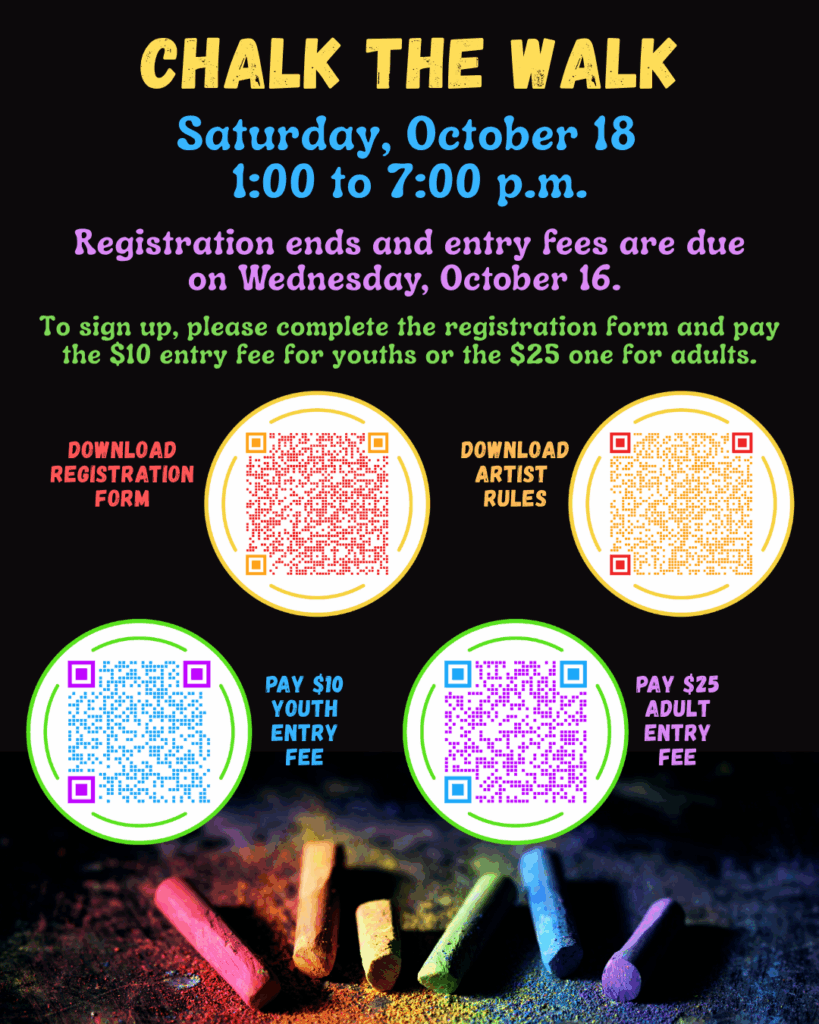 Chalk the Walk is scheduled from 1 to 7 p.m. Artists can sign up by completing the registration form. Please click the button below to download it.