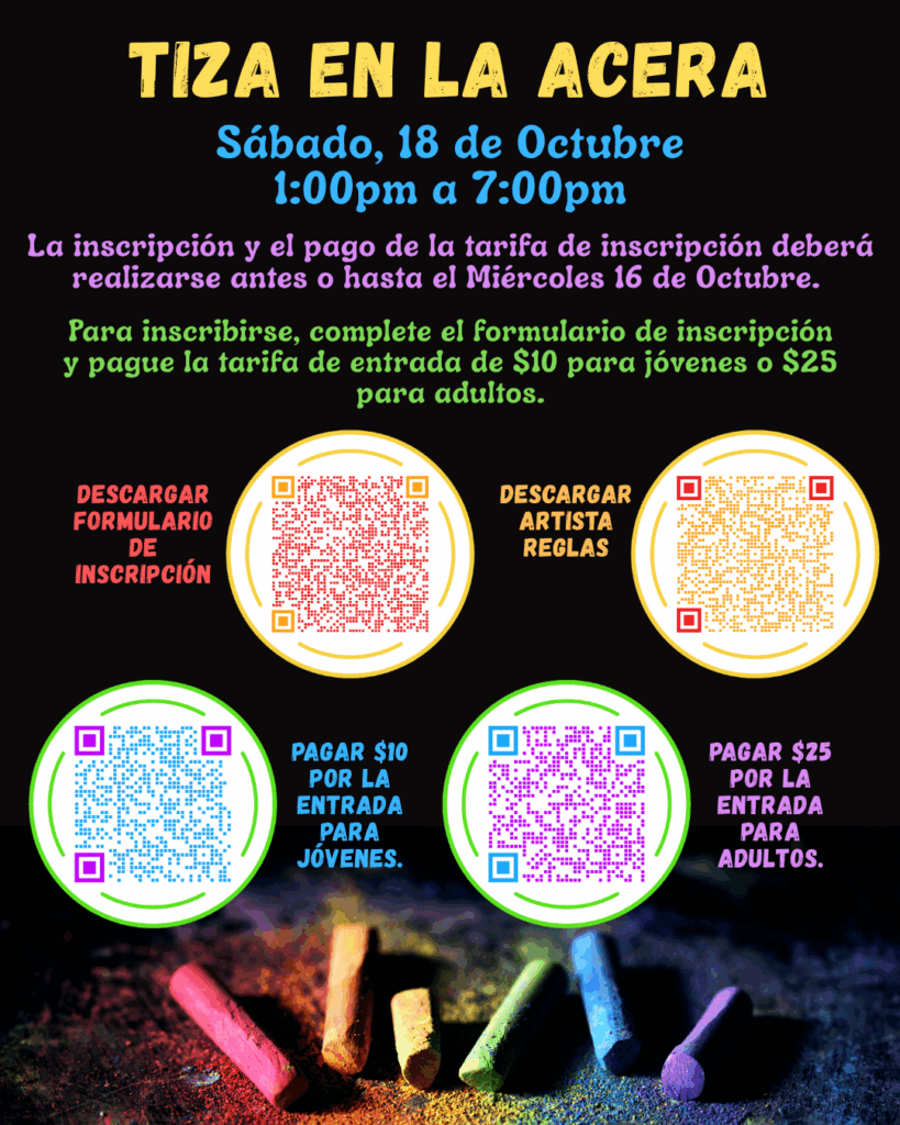 Tiza en la Acera está programado de 1 a 7 p.m. Los artistas pueden inscribirse completando el formulario de inscripción. Haga clic en el botón de abajo para descargarlo.