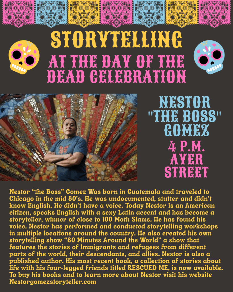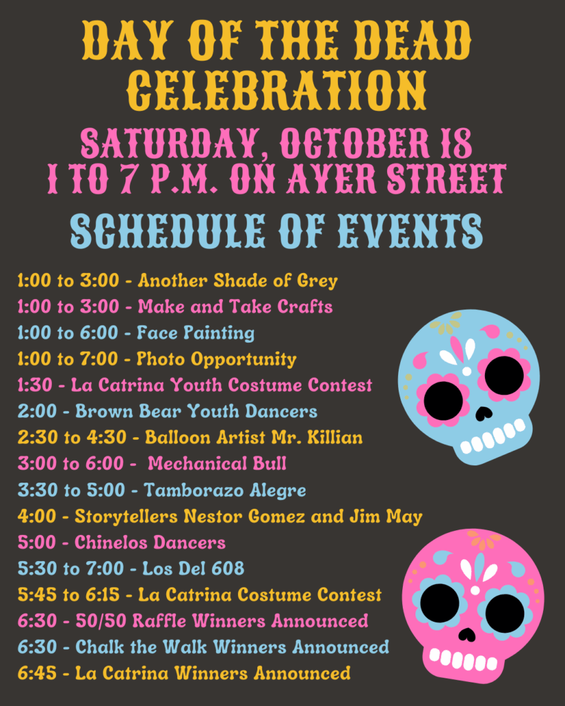 On Saturday, October 18, from 1 to 7 p.m., please join us on Ayer Street for the 2nd Annual Day of the Dead Celebration. There will be food trucks, a beer garden, live music, and various fun activities.